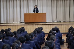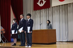 3学期始業式を実施しました。その後、生徒会役員認証式を実施し、新生徒会長が今後の意気込みを全校生徒へ向けて伝えました。 |