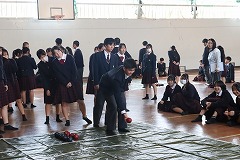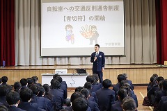 全校生徒を対象に交通安全教室を開催しました。西日本自動車学校から講師として4名来校いただき、自転車の安全な乗り方や罰則規定について実演・実体験を 交えながら分かりやすくご指導いただきました。 |