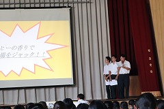 下の対面式後、部活動紹介が行われました。2・3年生は新入生に部活動の魅力を伝えようとそれぞれの部活動が工夫を凝らした部活動紹介をしていました。1年生は、どの部活動に入るか真剣に見入っていました。 |