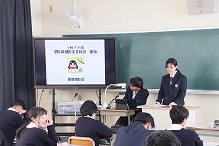 11月初旬に開催された学校保健安全委員会の内容を全校生徒に伝えるため、保健委員会の生徒が複伝を行いました。終礼の時間を活用し、考査期間中のスマートフォンの使用方法などについて注意喚起をしました。 |