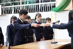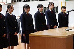 3学期始業式を実施しました。その後、生徒会役員認証式を実施し、新生徒会長が今後の意気込みを全校生徒へ向けて伝えました。 |