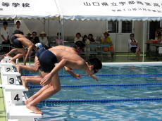 [16] 水泳大会 2008年7月9日 期末考査も終わり、最も宇部商らしい行事のひとつ、水泳大会が実施されました。クラス対抗総員リレーにはじまり、午前中は予選、午後からは決勝が行われました。厳しい闘いの結果、優勝を飾ったのは3年3組でした。 |