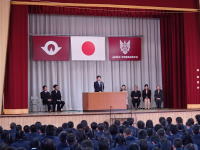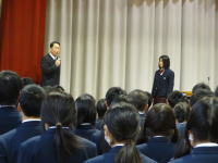 [31] 生徒会認証式 2014年1月23日去る12月11日~12日に実施されました立会演説会及び投票を経て決定した新生徒会の認証式が行われました。旧生徒会長の挨拶の後、新生徒会長の挨拶、役員及び各委員会の委員長・副委員長の発表がありました。 |