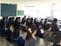 [29] 生徒の受験体験談 2014年1月15日3年生の就職者3名、大学進学者1名、専門学校進学者1名が各自の体験を1,2年生に発表しました。1,2年生は直接の先輩の実体験を聞くことで、就職・進学への意識を高めることができました。 |