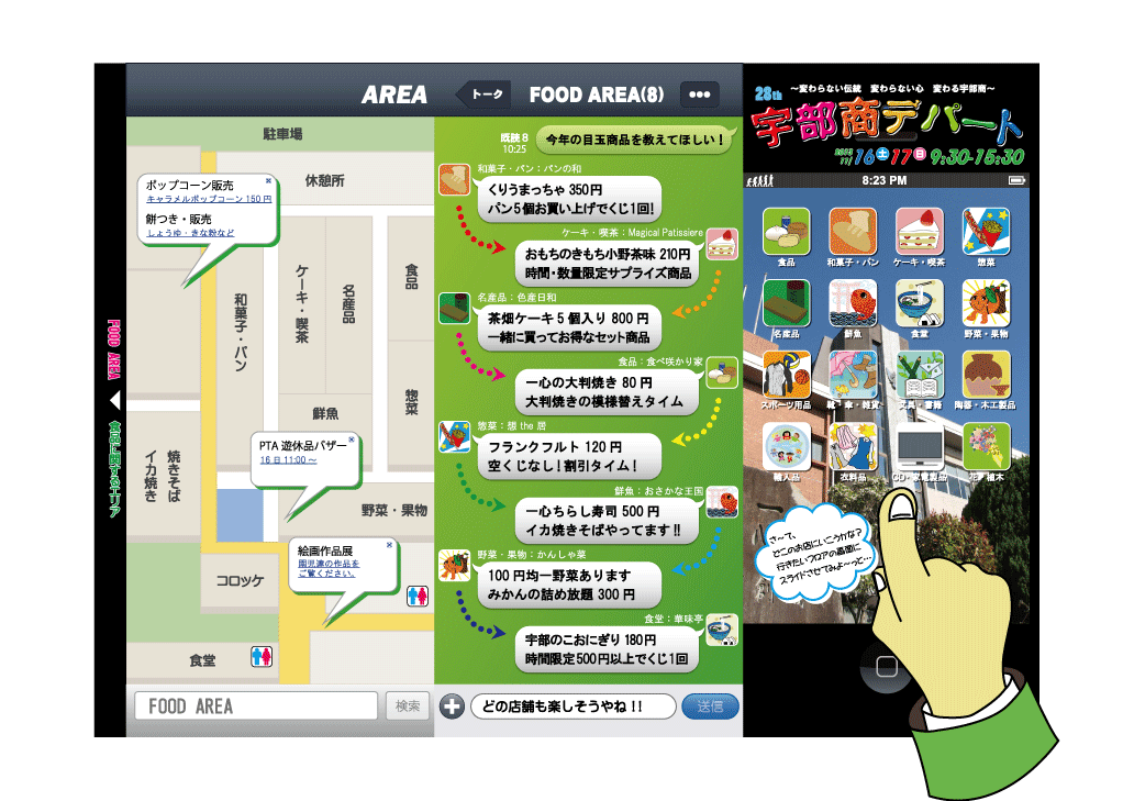 [22] 宇部商デパート 2013年11月17日~18日第28回目となる宇部商デパートは、2日間でのべ3,310人という多くのお客様に御来場していただきました。生徒による各種店舗の他、PTAの方々の餅つき・販売、餅まき、遊休品バザーなど内容も充実で、さらに新しい試みとしてポイントカードが導入されました。 |